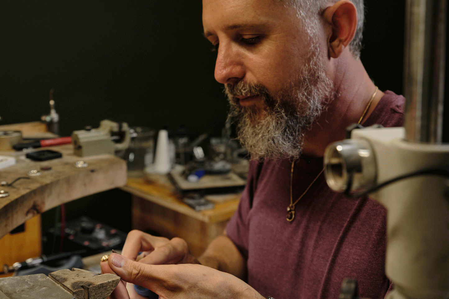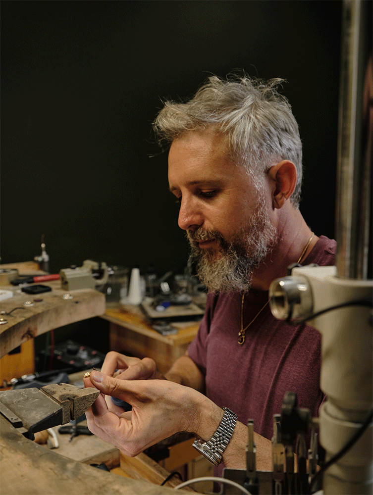 Introduced to the bench by his godmother, Myles discovered early the poetry of metal in the hand. His training spans Eurythmy and the art of repoussé in Switzerland, an apprenticeship with master goldsmith Zoltan David, and formal studies at the Gemological Institute of America (GIA), where he became a certified gemologist and jeweler. Experience at an atelier in Oakland, designing on demand and sourcing rare stones, further honed his technical precision and eye for detail.